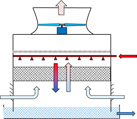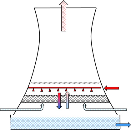 - Teplá voda přicházející z průmyslového procesu je rozstřikována nebo stéká přes výplň věže - chladicí systém (tzv. zkrápěcí povrch).